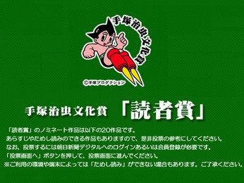 Twenty manga titles have been nominated for the 18th Tezuka Osamu Cultural Prize “Reader Prize”, the Asahi Shimbun paper announced on Tuesday. “Reader Prize” is created this year by Asahi Shimbun as a special event. Asahi Shimb
